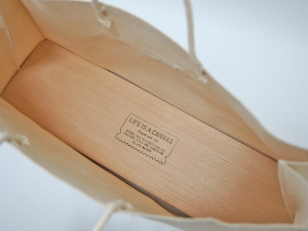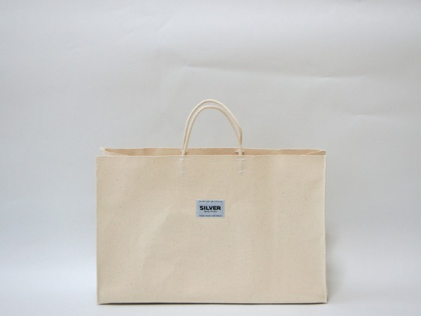 よく見かけるお買い物袋を厚手の6号帆布で製作しました。 ヨコ長ワイドサイズです。 本体の上部は、生地の耳(端)をそのまま使用しているのでほどけてきません。 型崩れしないように底板付きです。