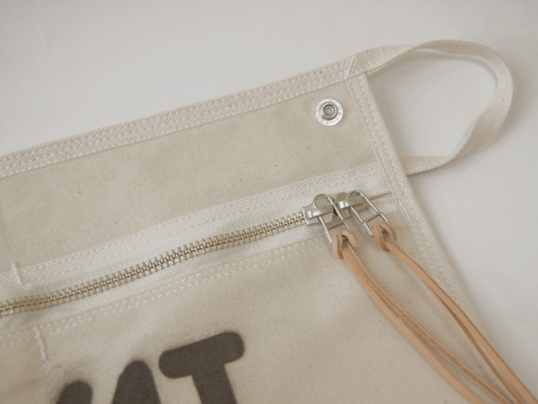 広げればヴィンテージのエプロンの形そのままで、ファスナー付きの間口が3つあります。