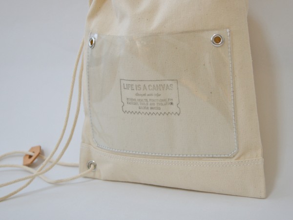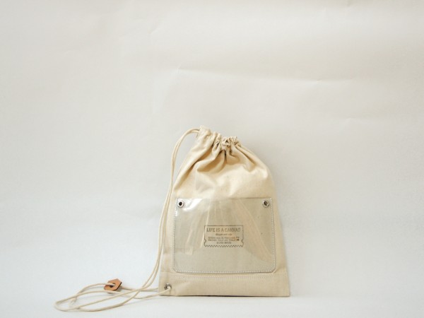 ミニサイズのナップサックです。 背面にビニル素材の収納ポケットがついています。 携帯電話、財布など少量の荷物でお出かけの際、サコッシュのような使い方が便利です。