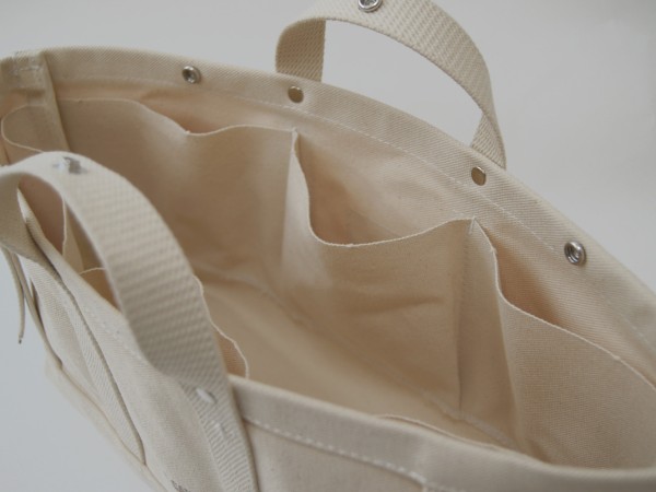 中のモノがよく見え、出し入れしやすいようにバッグ本体の高さは最低限に抑え、内部に収納ポケットを6つ取り付けています。