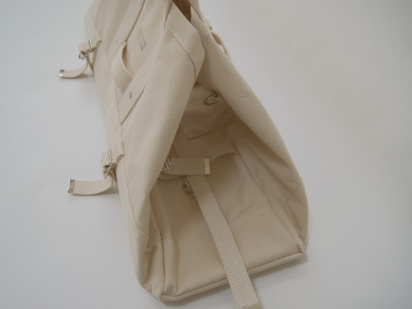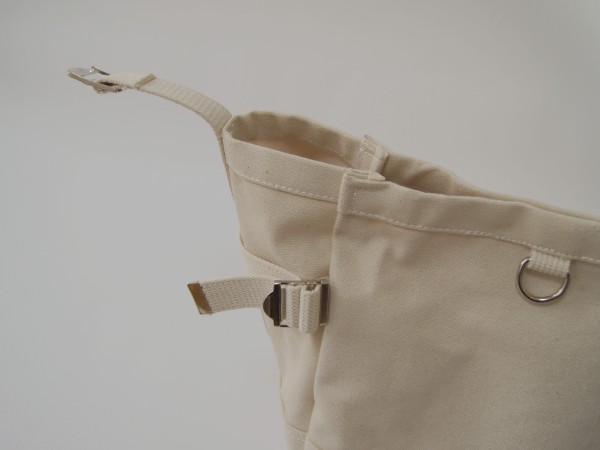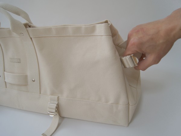 本体口部分のアジャスターで上部を絞り込み、脇と底部分のアジャスターではマチ巾を調整することも可能です。