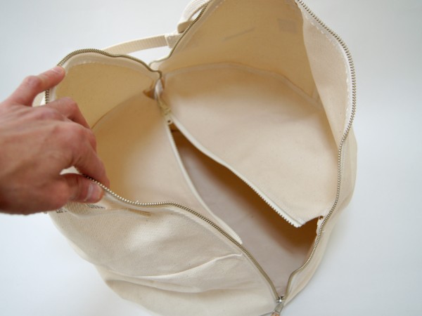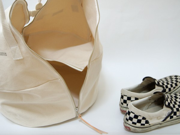 このバッグの特徴である開口部のファスナーはかなり大きく開くので、荷物の出し入れが容易です。さらに中底にも逆開のファスナーを取り付けることで下層の荷物も取り出しやすくしました。靴などを入れると便利でしょう。