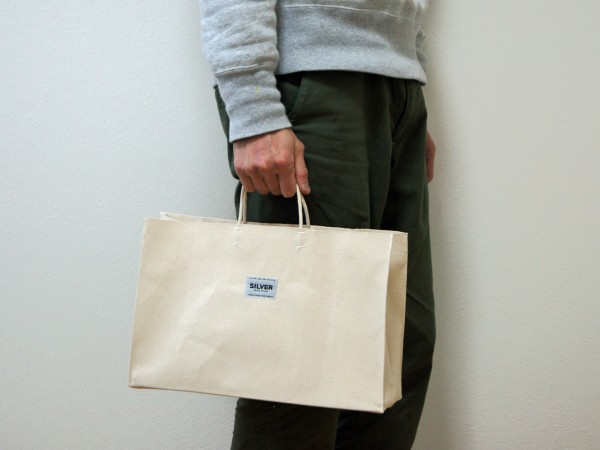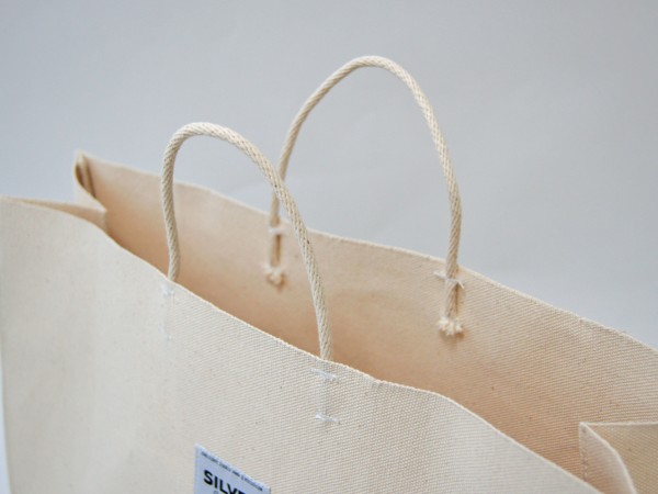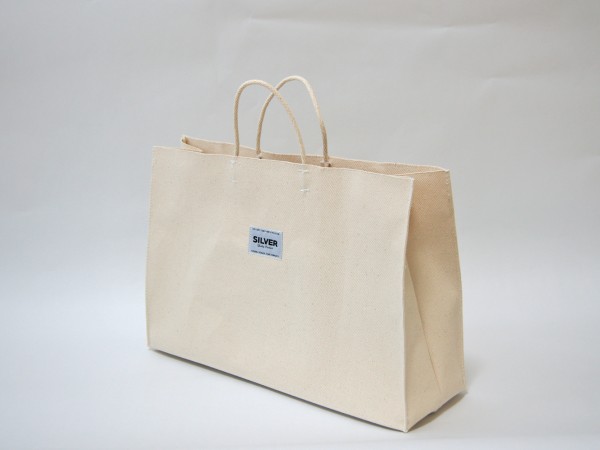 よく見かけるお買い物袋を厚手の6号帆布で製作しました。 ヨコ長ワイドサイズです。 本体の上部は、生地の耳(端)をそのまま使用しているのでほどけてきません。 型崩れしないように底板付きです。