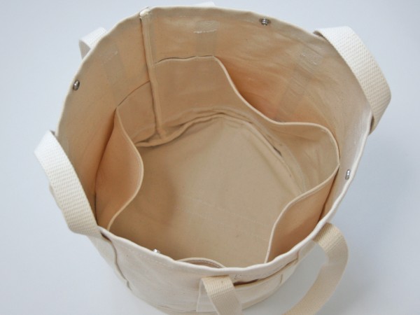大きめのドラム型ツールバッグです。 収納ポケットは内部に4つ、丸型なので中の荷物が見えやすく取り出しやすいのが特徴です。 取っ手の長さは2パターン備わり、それぞれシーンに合わせて使い分けることが可能です。 本体上部にドットボタンが付いていますので、工具入れとしてはもちろん普段使いとしても気の利いたバッグです。