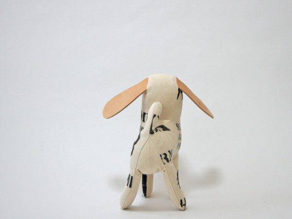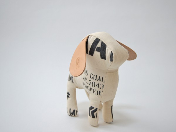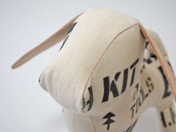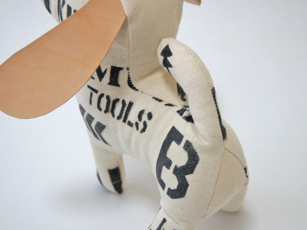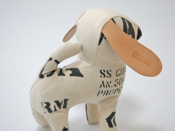 前面にステンシルをほどこした犬のぬいぐるみです。 SILVERの刻印が入った大きな耳はヌメ革を使用しています。 お気に入りの角度を見つけてみましょう。