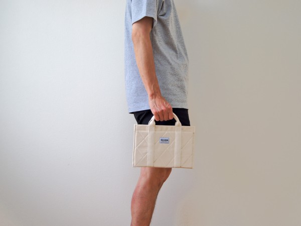 マチなしのミニトートです。 6号帆布の表地と裏地の間にウレタン素材を挟んでダイヤ柄のキルトステッチをほどこしています。 通常の帆布より、さらにハード感が増しています。 携帯と財布程度のわずかなサイズ感です。 真ん中に1ヵ所ドットボタンが付いています。