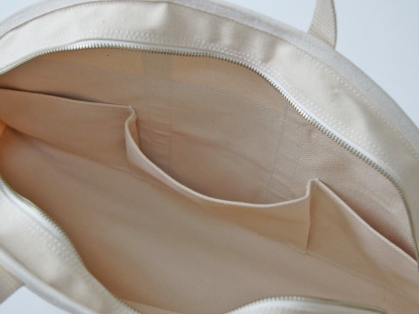 背面側に大きめのポケットが3つ、下側のポケットはカン止めによるポケット口の仕切りが2ヵ所、上側のポケットは中央に仕切りがあります。