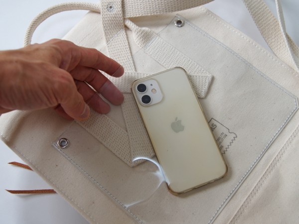 背面の透明ポケットは携帯電話、チケットなど見えやすく取り出しやすいので便利です。