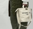 ステンシルが両面にほどこされており、ショルダー紐がぐるりと本体を一周している無骨な仕様がなんとも特徴的です。