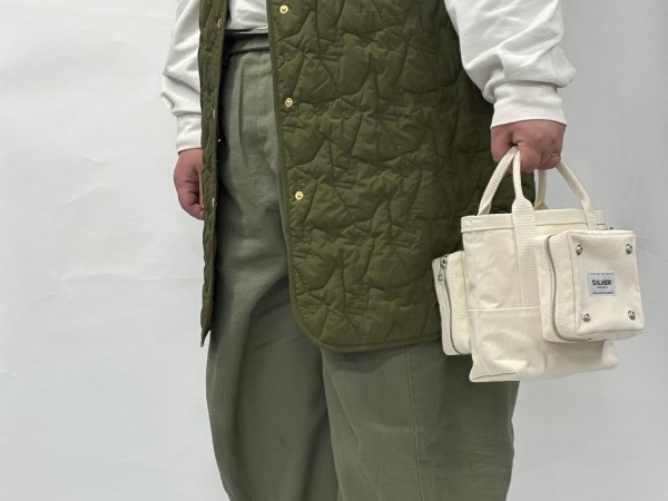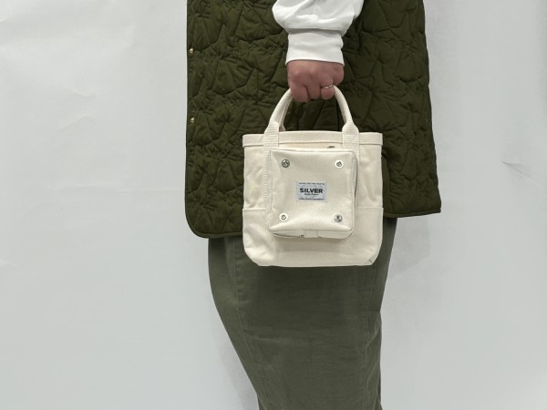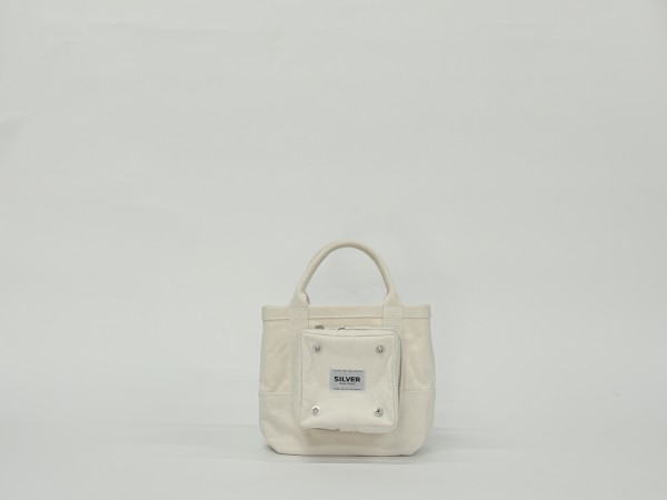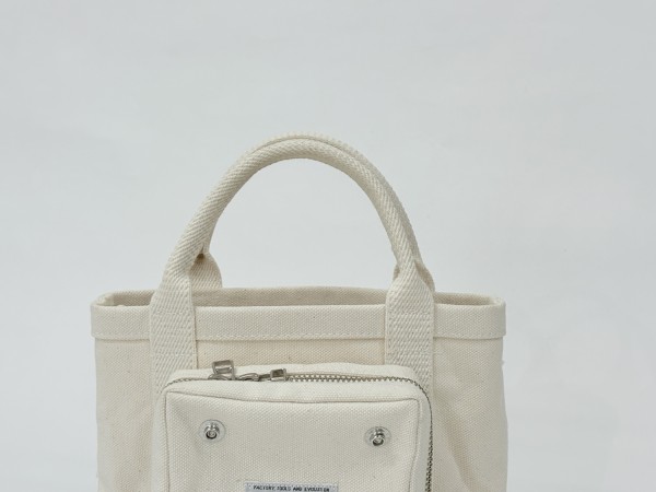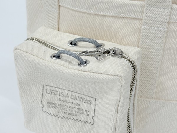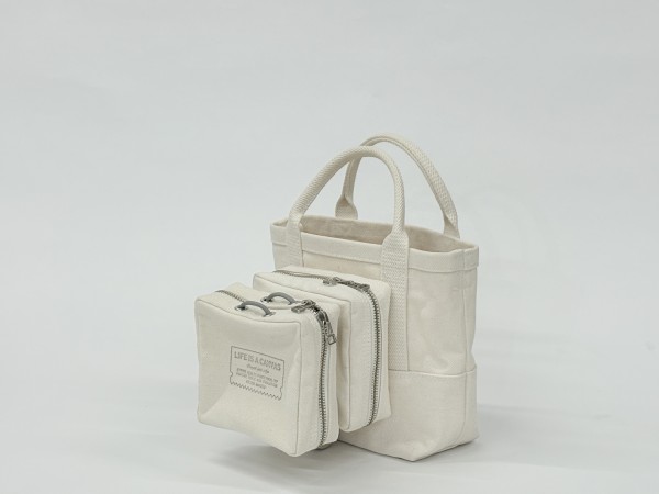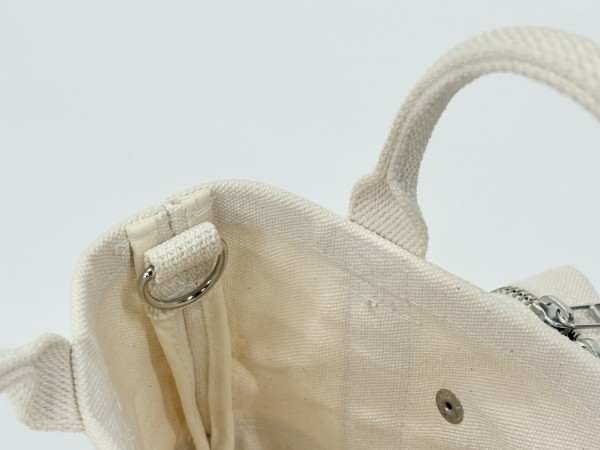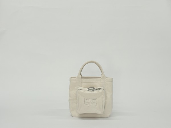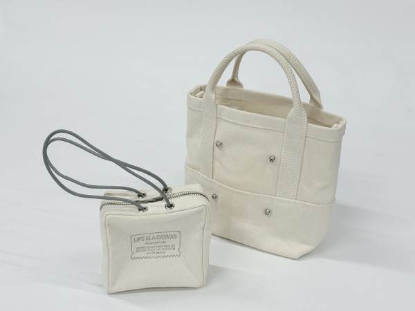 フロントバック両面にミニバッグを搭載した小ぶりなトートバッグです。